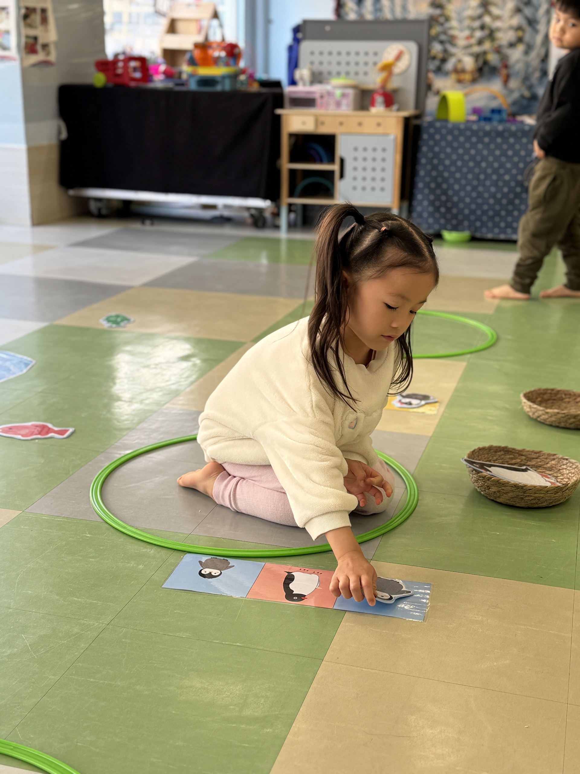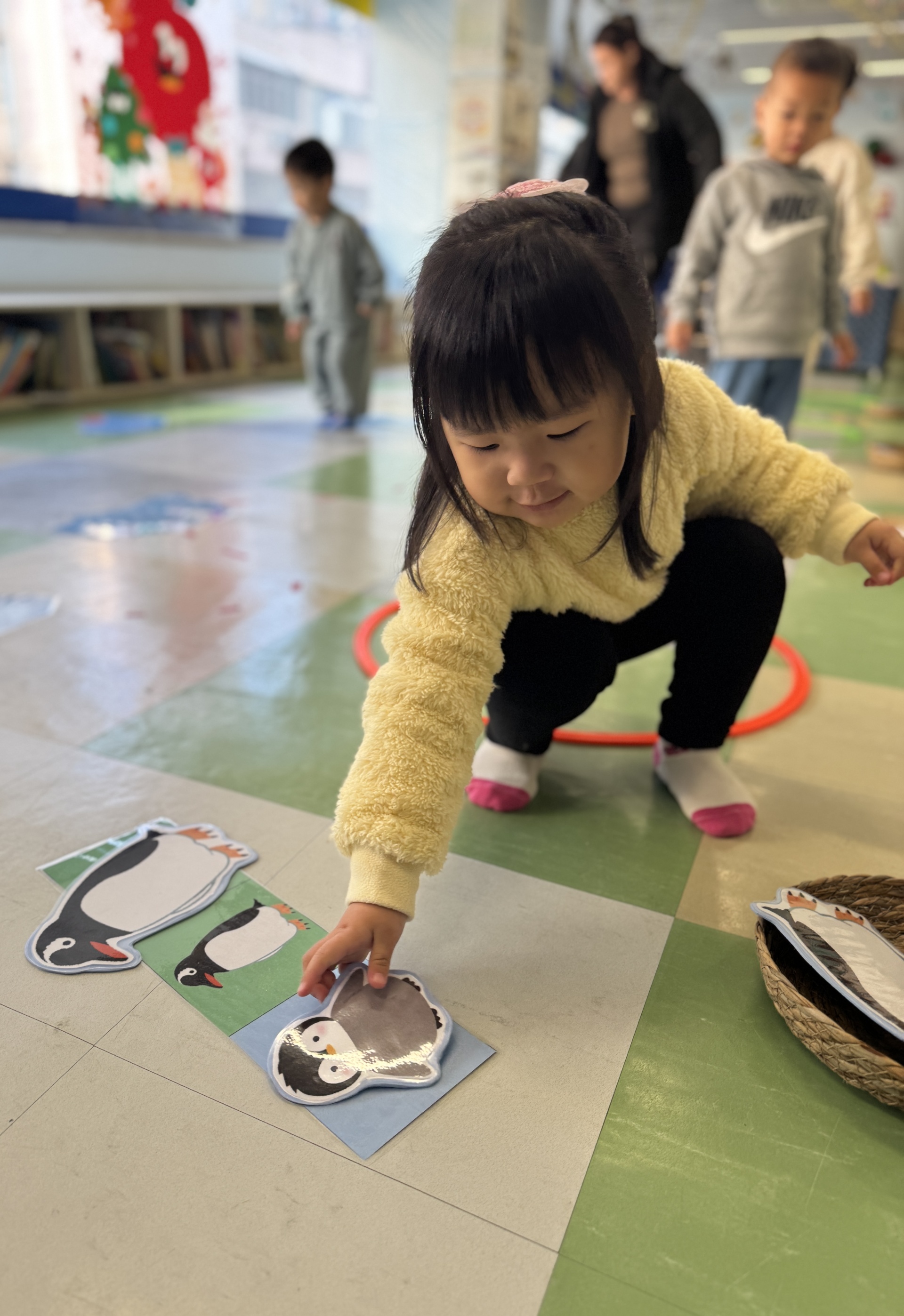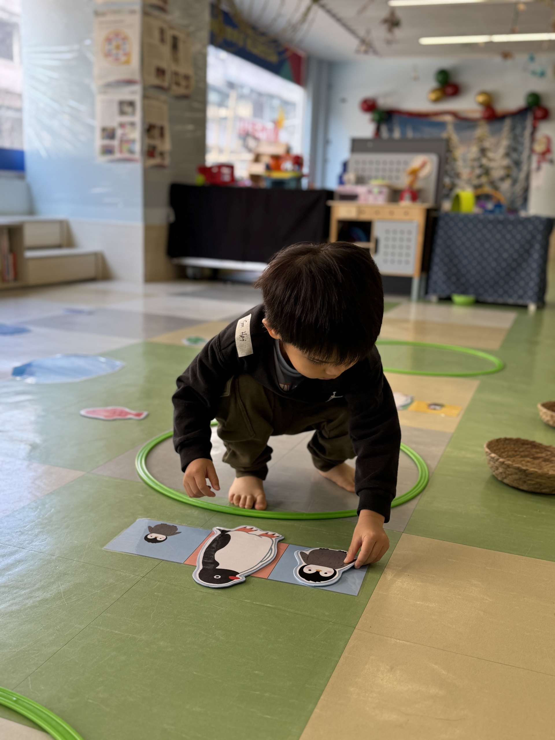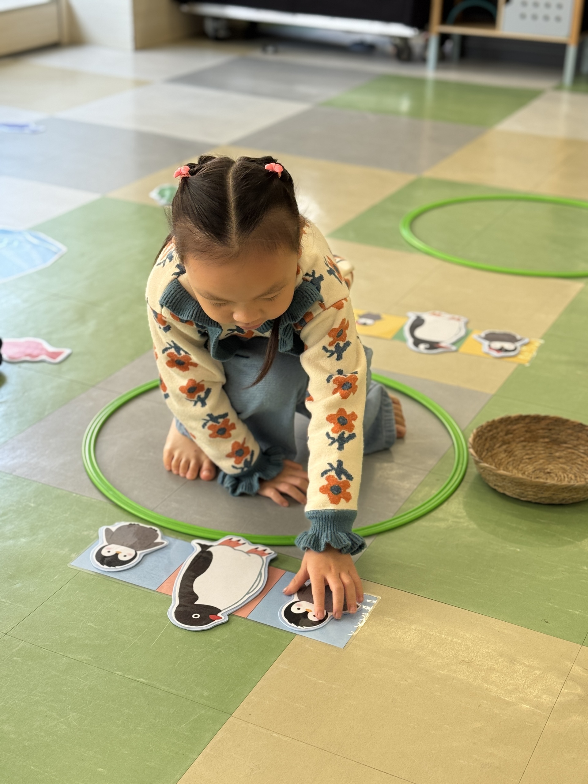 Today, we had an exciting Arctic adventure filled with learning, creativity, and teamwork. Our little explorers began their journey as polar scientists, discovering the Arctic food chain. The real adventure began on the icy seas! We carefully stepped from "iceberg" to "iceberg" as they "fished" for little fishes to feed their hungry penguin friends. Furthermore, we also used paper plates, black paint and cotton balls to make our own unique penguins.